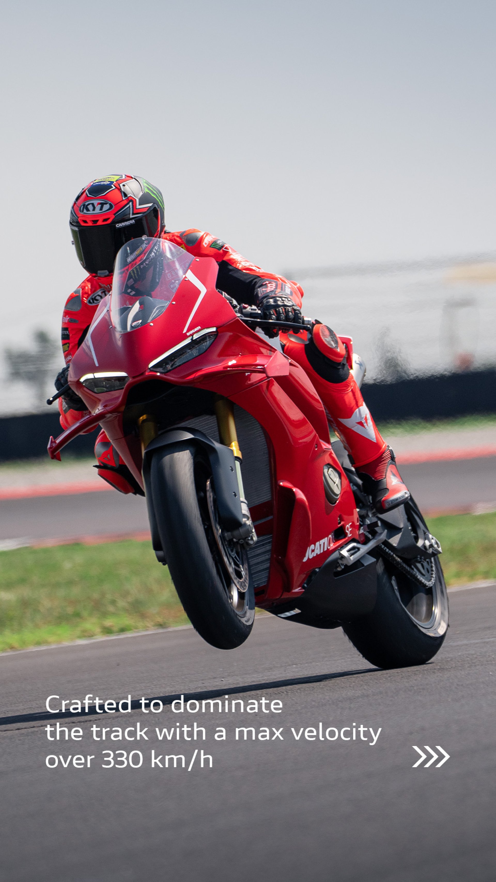- Door de toepassing van een niet-goedgekeurde raceuitlaat haalt de nieuwe Panigale V4 R een topsnelheid van meer dan 330 km/u, een waarde die voorheen was voorbehouden aan MotoGP motoren
