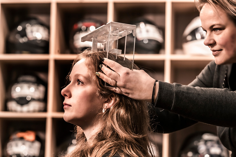 Tijdens de Shoei Personal Fitting wordt het hoofd van de klant opgemeten met behulp van een speciaal meetinstrument. Hiermee wordt de omtrek van het hoofd en de afstand tussen verschillende punten opgemeten om zo de juiste helmmaat te bepalen en uiteindelijk de beste pasvorm voor jouw hoofd.